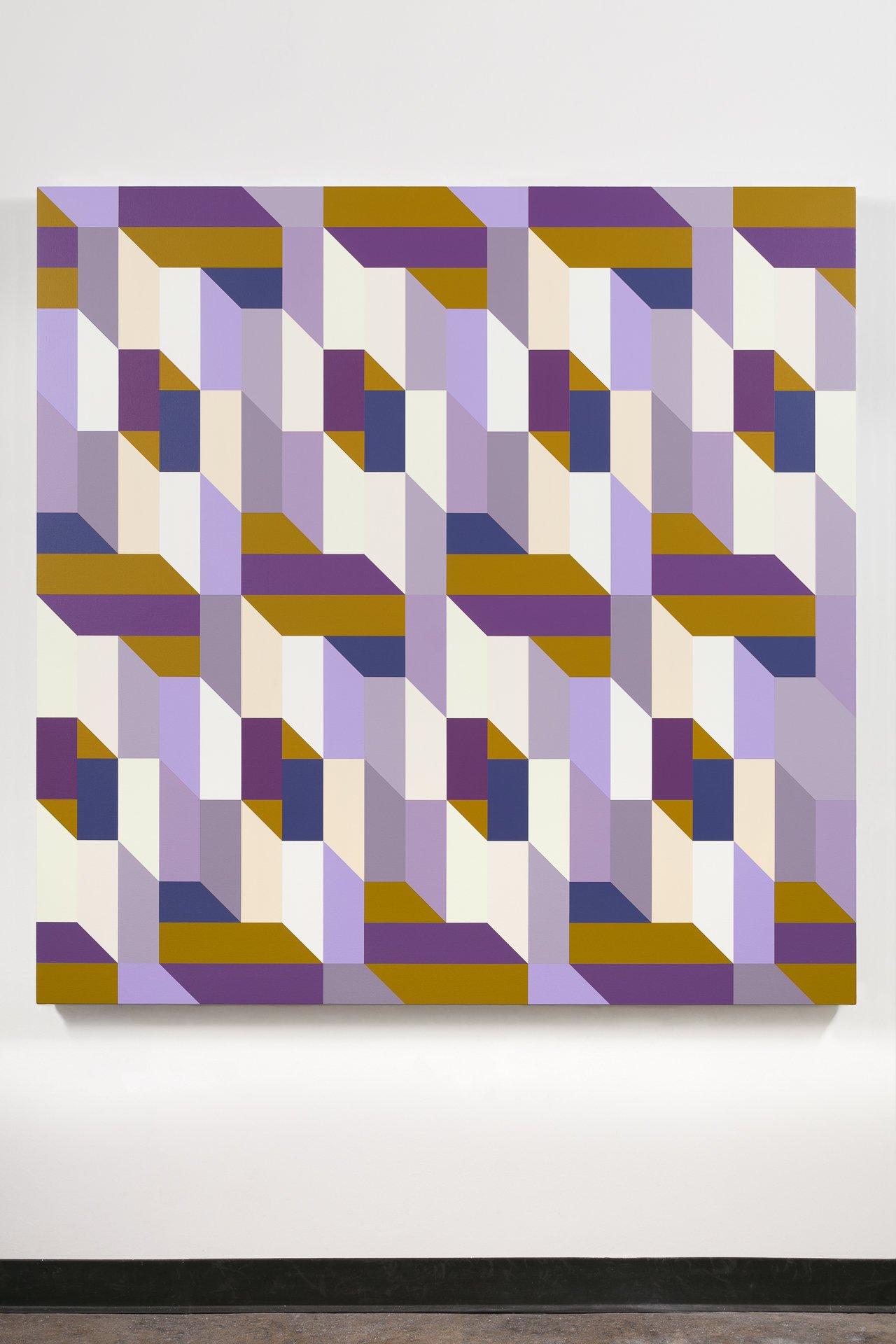 NEW YORK, NY.- David Richard Gallery is presenting Andrew Huffman’s first solo exhibition in New York City and his second solo with the gallery. The presentation includes 10 new canvases organized as 4 single paintings and 3 diptychs. The sizes of the artworks range from 30 x 30 inches up to 60 x 60 inches square and a couple measuring 30 x 60 inches in horizontal formats. This is a debut of not only diptych canvases, but also all new compositions that depart from his familiar woven lattice format. These new paintings are based on pentagonal tessellations where the pentagon shapes are abstracted and assembled in rigorous grid-like repeating patterns as well as tessellated to generate asymmetric compositions. Huffman has cleverly leveraged the asymmetry and combined this feature within the diptych compositions. Each panel has an asymmetric arrangement of shapes. However, the pair of paintings within a diptych are mirrored compositionally, but not with respect to the specific arrangement of colors in each. Thus, at first glance, each canvas singly as well as the diptych, reads as asymmetric compositions and in a narrative fashion. Ignoring the color placement in each canvas and looking only at the arrangement of the internal shapes in each diptych, the overall structures are symmetrical. Therefore, all remains well in the universe of geometry and pattern painting.